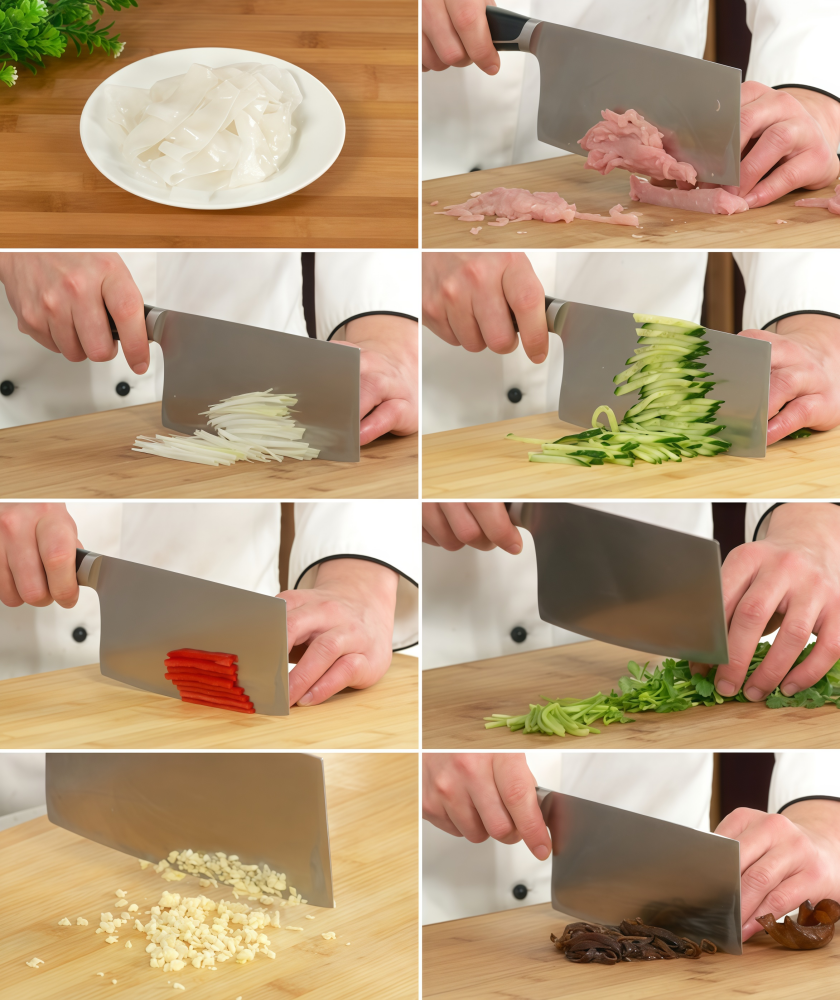 Take 150g of fresh rice noodles and set aside. Shred 100g of pork tenderloin, 75g of scallions, 70g of cucumbers, 30g of red peppers, cut 10g of coriander stems into sections, crush and mince 10g of garlic cloves, and cut 50g of soaked tree ear mushrooms into shreds after removing the stalks.